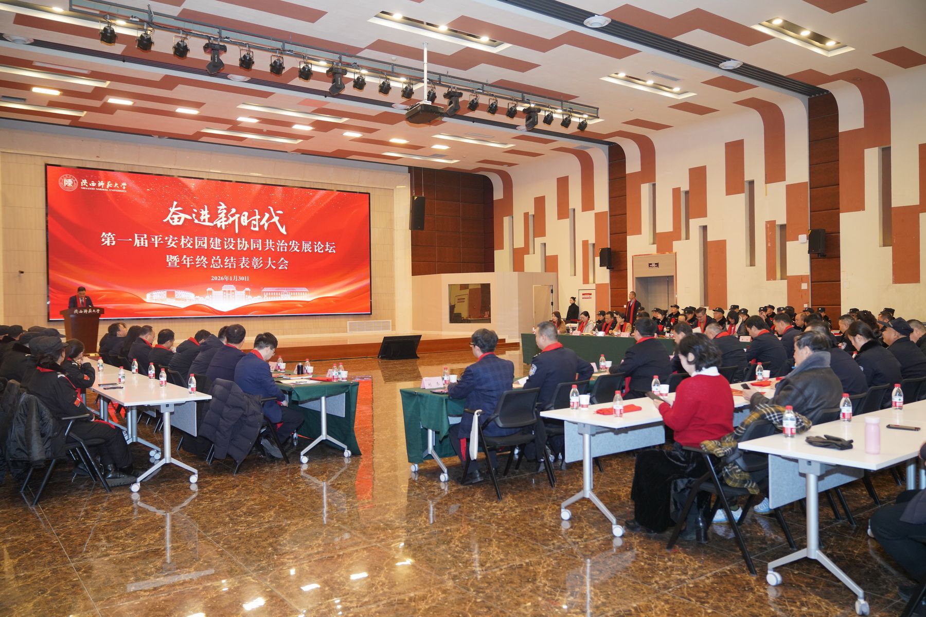 1月30日,我校“奋进新时代——首届平安校园建设协同共治发展论坛暨保卫工作年终总结表彰大会”在新勇学生活动中心举行。校长陈新兵、副校长王云博,省委教育工委稳定办、西安市公安局经文保大队,属地公安、交警、消防等单位负责人出席活动。